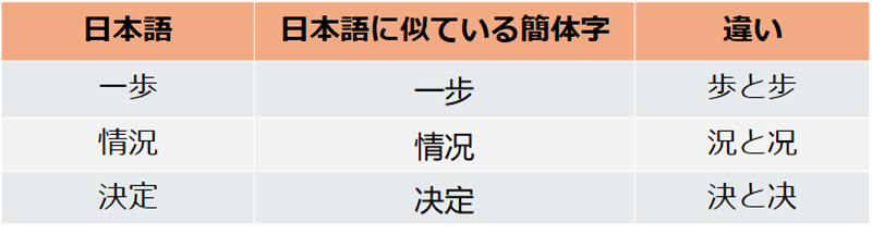 上記の表では同じ単語を簡体字と繁体字に翻訳したときの違いを表しています。