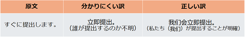 日本語の特徴の一つに、「主語が頻繁に省略される」点が挙げられます。機械翻訳の場合、文脈から主語を正しく推測できず、全く異なる意味の中国語翻訳を生成してしまうことがあります。