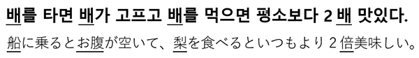 ここで、腹、梨、船、倍の意味を持つ배(ペ)の例を見てみましょう。