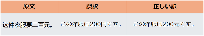 この場合、「元」を単純に「円」に置き換えてしまっています。他にも「斤(500グラム)」、「里(500メートル)」など中国語固有の単位には特に注意が必要です。