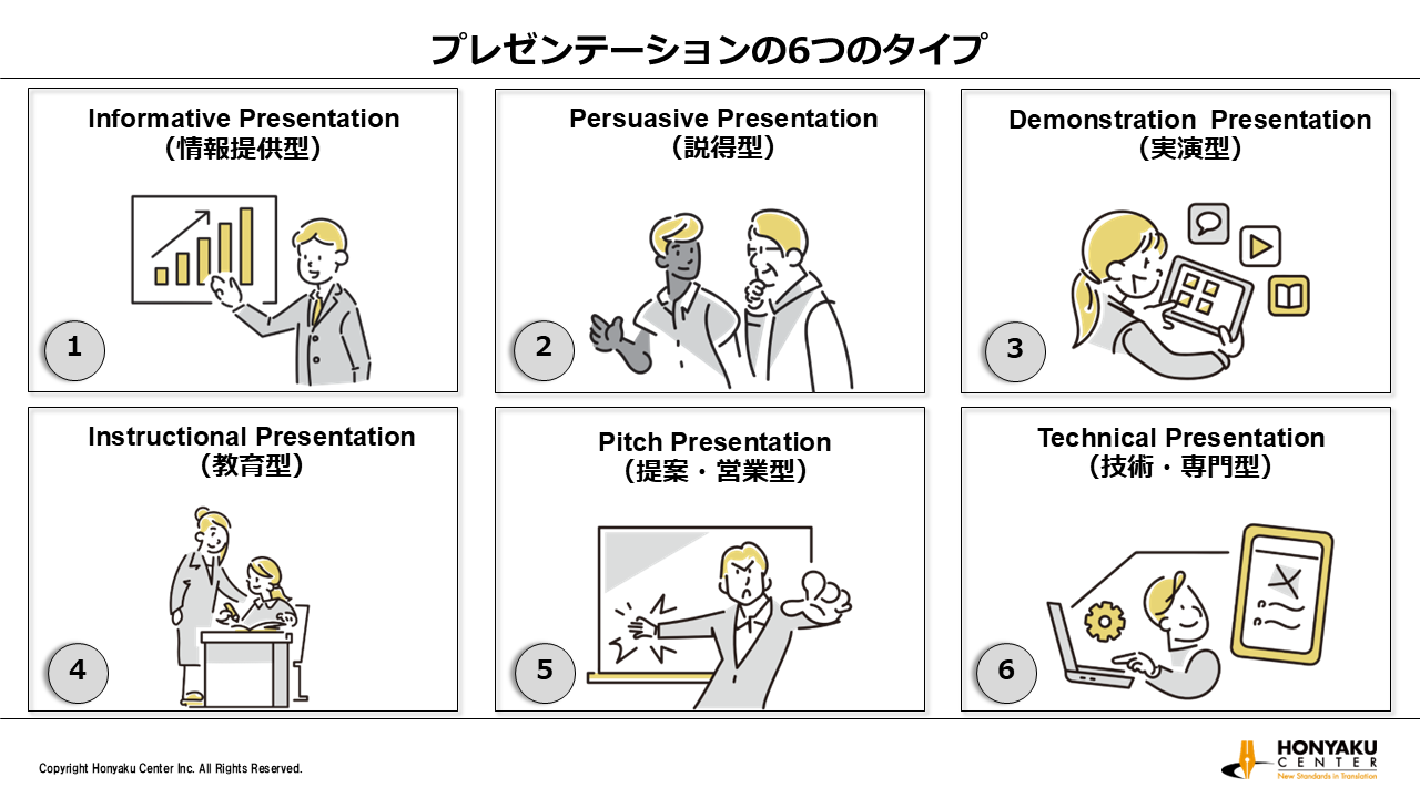 この記事では、特に注目したい2つ、「1. Informative Presentation(情報提供型)」と「5. Pitch Presentation(提案・営業型)」を深掘りします。